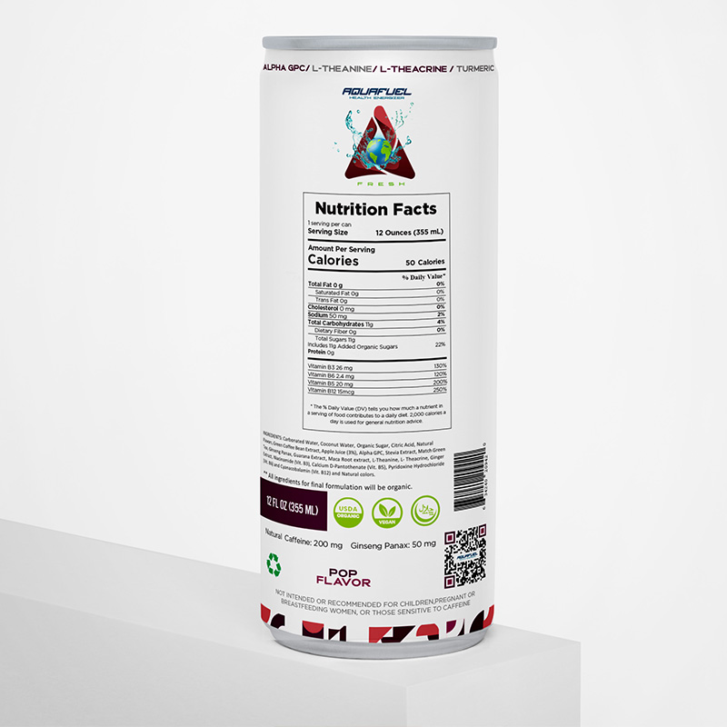 Carbonated Water, Coconut Water, Organic Sugar, Citric Acid, Natural Flavors, Green Coffee Bean Extract, Apple Juice (3%), Alpha GPC, Stevia Extract, Match Green Tea, Ginseng Panax, Guarana Extract, Maca Root extract, L-Theanine, L- Theacrine, Ginger Extract, Niacinamide (Vit. B3), Calcium D-Pantothenate (Vit. B5), Pyridoxine Hydrochloride (Vit. B6) and Cyanacobalamin (Vit. B12) and Natural colors.