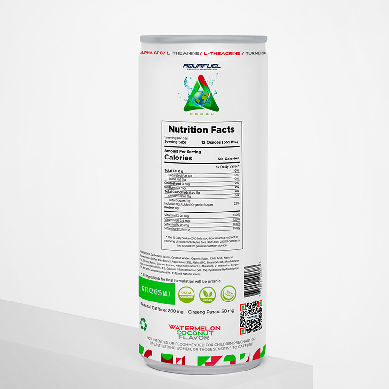 Carbonated Water, Coconut Water, Organic Sugar, Citric Acid, Natural Flavors, Green Coffee Bean Extract, Apple Juice (3%), Alpha GPC, Stevia Extract, Match Green Tea, Ginseng Panax, Guarana Extract, Maca Root extract, L-Theanine, L- Theacrine, Ginger Extract, Niacinamide (Vit. B3), Calcium D-Pantothenate (Vit. B5), Pyridoxine Hydrochloride (Vit. B6) and Cyanacobalamin (Vit. B12) and Natural colors.